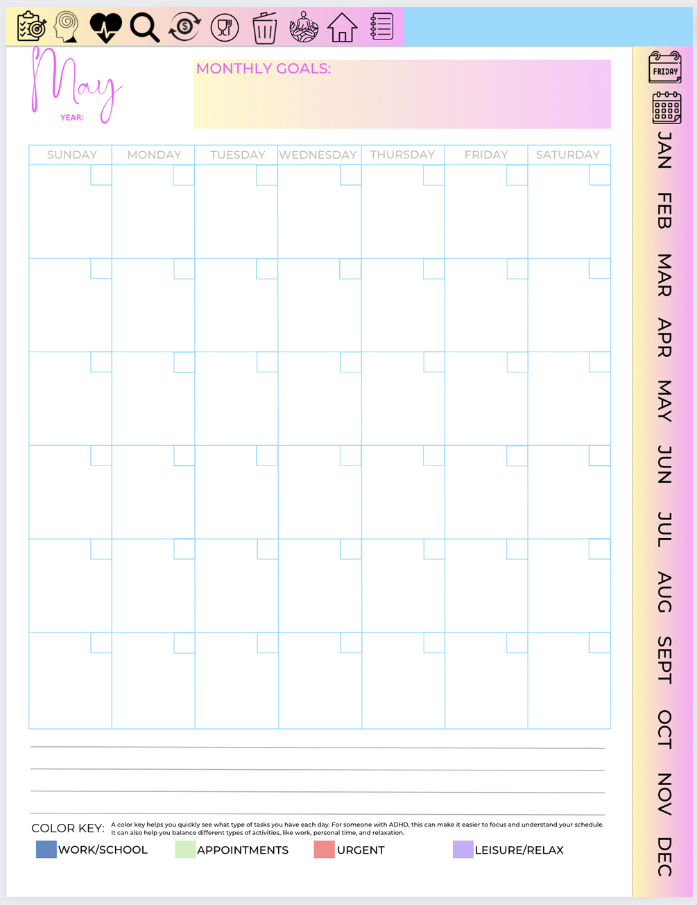 Presenting a comprehensive ADHD/Neurodivergent Planner, designed to cater to the unique needs of individuals with ADHD or those who are neurodivergent. This digital planner is a powerful tool that promotes self-awareness, goal-setting, time management, and personal growth.